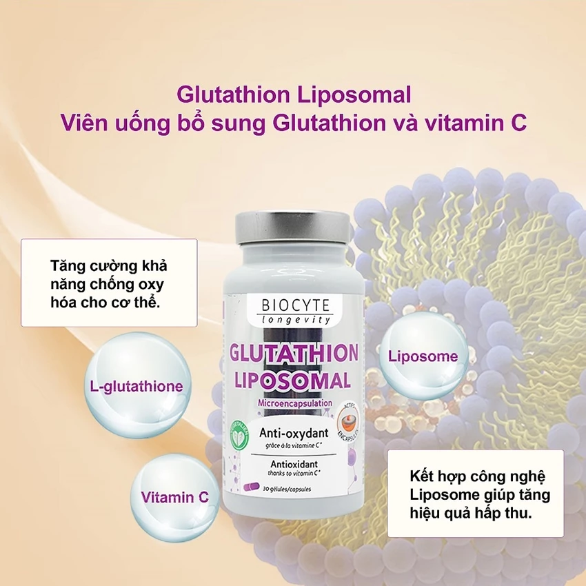 Viên uống Glutathion Liposomal là sản phẩm bổ sung Glutathione cho cơ thể. Glutathione là một chất chống oxy hóa mạnh, có khả năng ngăn ngừa các tổn thương tế bào do gốc tự do và peroxit gây ra, hỗ trợ làm đẹp da, bảo vệ sức khỏe.