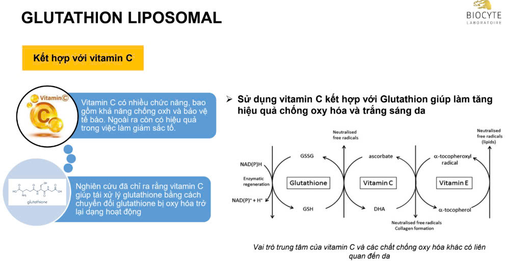 - Glutathion kết hợp vitamin C tăng cường tác dụng chống oxy hóa.