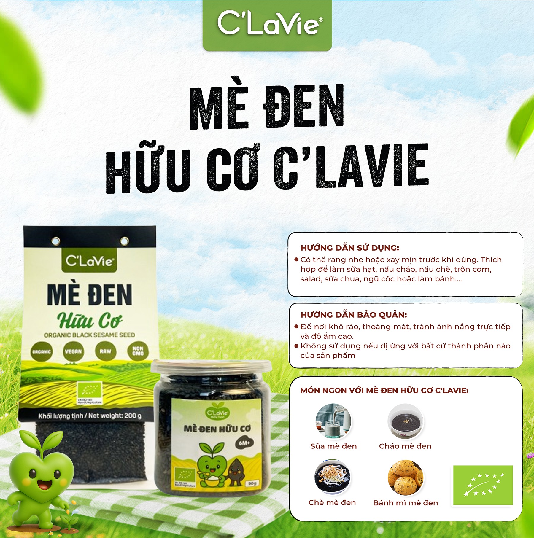 - Thành phần: 100% mè đen hữu cơ