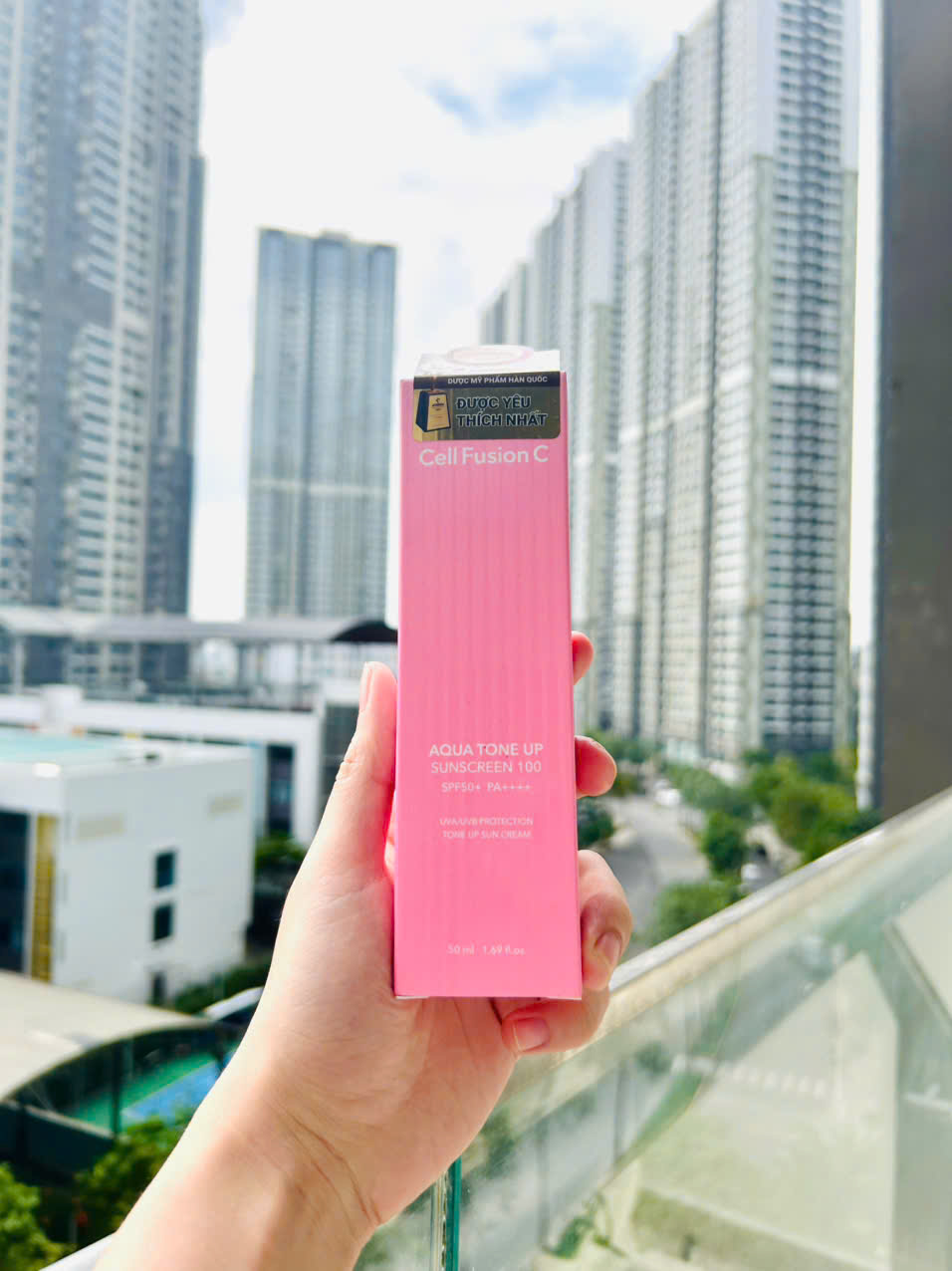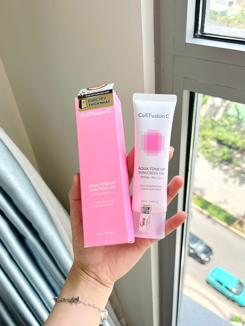 Cell Fusion C Aqua Tone Up Suncreen 100 SPF 50+ PA++++ kem chống nắng nâng tone giúp bảo vệ da trước tác hại của tia UV, đồng thời cấp ẩm dịu nhẹ trên da.