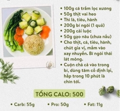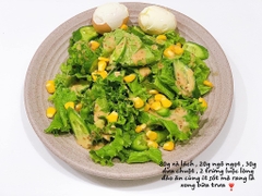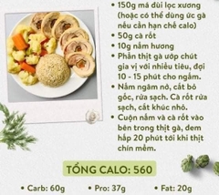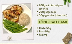 - Cơm cá ngừ/cá thu sốt cà chua ít gia vị + 5 loại rau củ luộc (cà rốt, súp lơ, đậu đũa, đậu cove, đậu bắp, cải thảo, củ dền,...).