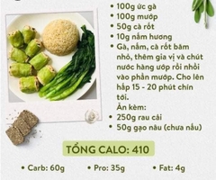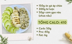 - Cơm ức gà nuôi thả tự nhiên luộc + rau củ xào nhiều loại + canh bí đỏ