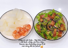- Cơm ức gà xào nhiều loại rau củ (súp lơ, cà rốt, ớt chuông) + canh rau cải