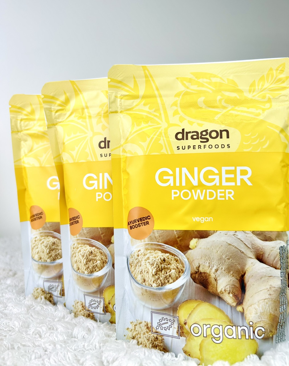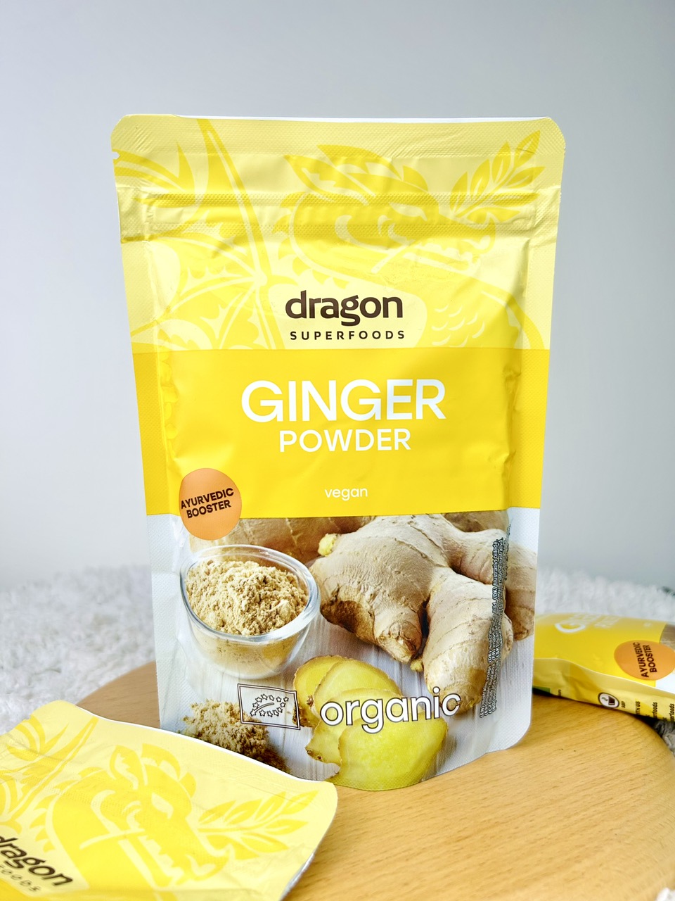Bột gừng hữu cơ (Dragon Superfoods Ginger Powder) là 100% củ gừng khô hữu cơ. Siêu thực phẩm này, được biết đến như một loại gia vị, có vị cay nồng, mùi thơm cam quýt và tác dụng làm ấm. Chuẩn bị Dragon Superfoods Bột gừng như một loại trà, thêm vào súp, món mặn, cũng như bánh ngọt, bánh quy và bánh gừng. Nó cũng là một kết hợp hoàn hảo cho nước trái cây tươi, sinh tố trái cây và rau quả.