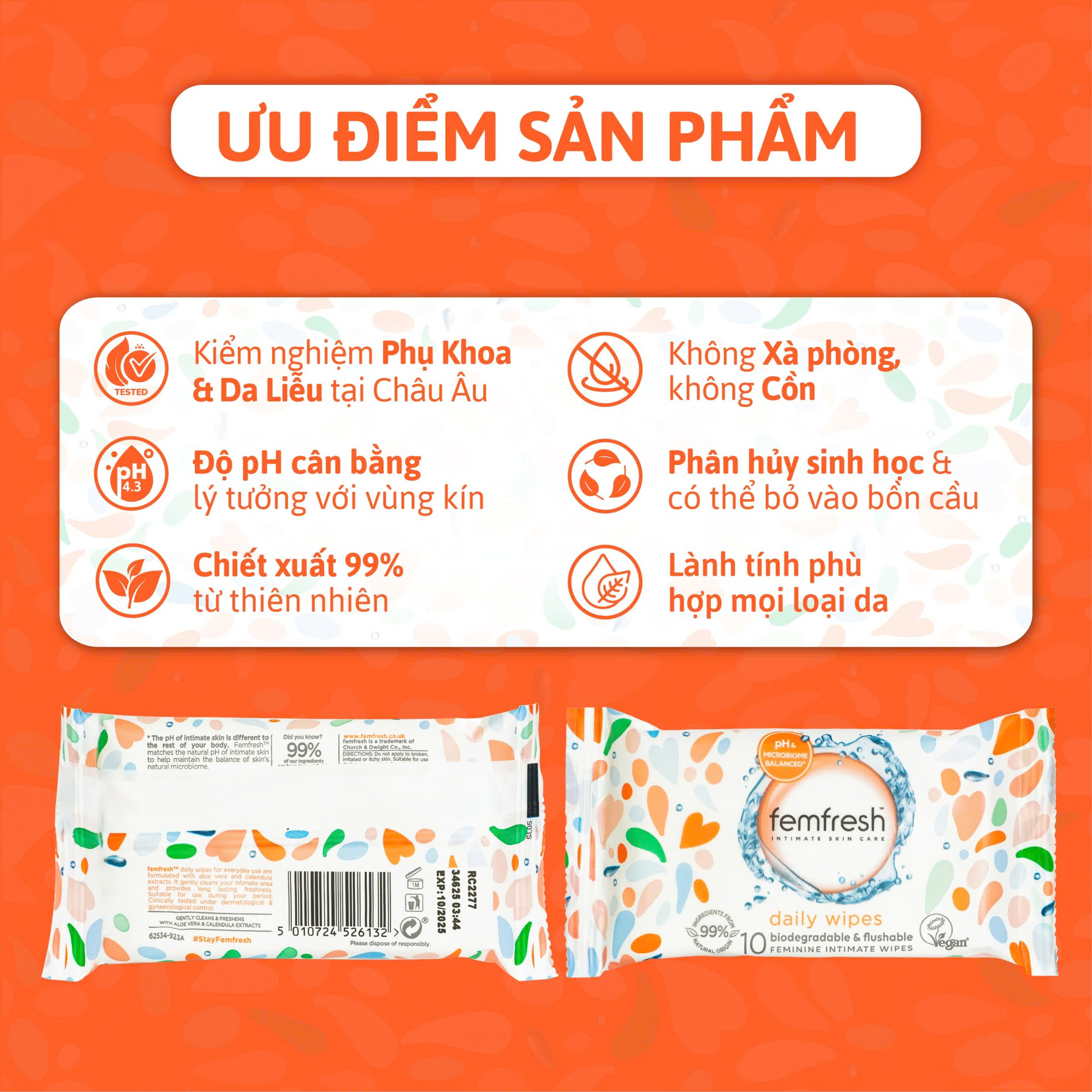 - Khăn ướt vệ sinh vùng kín hằng ngày cao cấp Femfresh Intimate Skin Care Daily Wipes là sản phẩm vệ sinh chuyên dụng hàng ngày dành cho vùng kín giúp làm sạch, khử mùi hôi, hỗ trợ kháng khuẩn, kháng viêm đồng thời nuôi dưỡng làn da vùng kín,…
