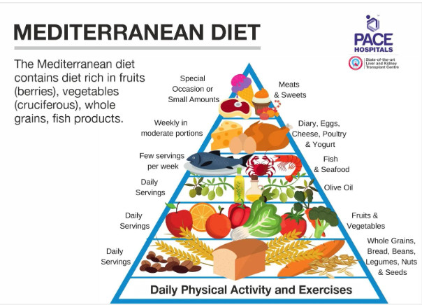 Chế độ ăn ĐỊA TRUNG HẢI: Chế độ ăn Địa Trung Hải là chế độ ăn nhiều trái cây, rau, ngũ cốc, các loại hạt và dầu ô liu; ăn vừa phải thịt gia cầm, cá và rượu vang; ăn ít đồ ngọt, thịt đỏ và các sản phẩm từ sữa.
