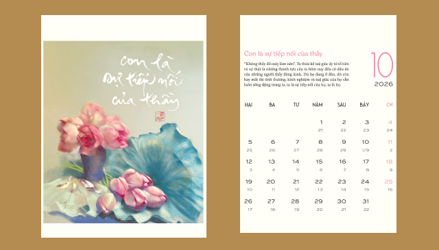 Năm nay, Tăng thân Làng Mai cùng Thái Hà Books trân trọng gửi đến bạn ấn phẩm lịch đặc biệt với chủ đề “Lòng đất nở hoa trời”. Mỗi tờ lịch không chỉ là một mốc thời gian, mà còn là một cánh cửa nhỏ dẫn về chánh niệm – nhắc ta dừng lại, thở sâu và sống thật.