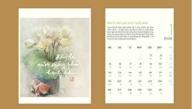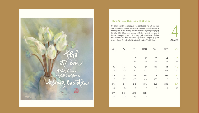 Bộ lịch gồm 12 thông điệp thư pháp nhẹ nhàng, sâu sắc từ Thiền sư Thích Nhất Hạnh như: Thở đi con, thở thật sâu thật chậm, không sao đâu; Lắng nghe; Con về nương tựa đất Mẹ; Lòng hôm ấy sẽ là lòng muôn thuở; Đây là một giây phút hạnh phúc… kết hợp cùng tranh hoa sen của hoạ sĩ Trịnh Lữ – biểu tượng của giác ngộ và thanh tịnh, nở lên từ lòng đất, như nhắc ta: hạnh phúc và hiểu biết có thể bắt đầu từ chính nơi ta đang đứng.