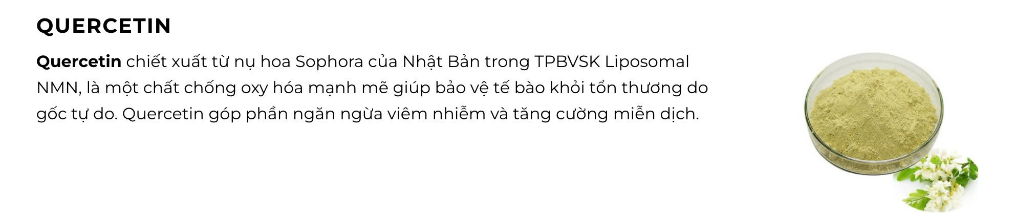 Hoạt chất NMN có tác dụng làm giảm mệt mỏi bằng cách tăng cường sản xuất năng lượng, giảm stress, oxy hóa, cải thiện chức năng não bộ và nâng cao chất lượng giấc ngủ. Quercetin và Trans-resveratrol là các dạng Polyphenol bảo vệ tế bào khỏi tổn thương do gốc tự do gây ra, giảm viêm và ức chế sự phát triển của tế bào ung thư.