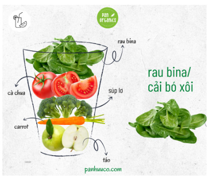 - Rau xanh màu sẫm: rau bina/cải kale/… nếu không có, hoặc không có thời gian, thay bằng bột nước ép cần tây hữu cơ hoặc bột siêu thực phẩm xanh. Ưu tiên có rau để có chất xơ nhé!