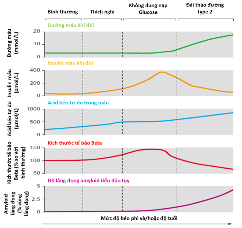 Đường huyết được duy trì trong giới hạn bình thường nhờ sự cân bằng giữa quá trình tiết insulin từ các tế bào beta đảo tuỵ và độ nhạy cảm insulin của mô ngoại vi (gan, cơ và mô mỡ). Khi độ nhạy cảm với insulin giảm, cơ thể phải tăng tiết insulin để duy trì mức độ dung nạp đường. Ở trẻ em, độ nhạy cảm với insulin giảm trong thời kỳ dậy thì và/hoặc do béo phì được bù trừ bằng cách tăng tiết insulin. Tuy nhiên, khi các tế bào beta không tiết đủ lượng insulin cần thiết để bù trừ cho tình trạng kháng insulin sẽ xảy ra tình trạng mất cân bằng đường huyết, khởi phát tình trạng tiền đái tháo đường và đái tháo đường thực sự với các biểu hiện trên lâm sàng.