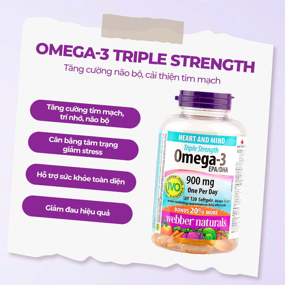 - Hàm lượng Omega 3 cao gấp 3 lần so với các sản phẩm thông thường. (Các sản phẩm thông thường chỉ chứa khoảng 180mg EPA và 120mg DHA trong khi Webber Naturals chứa 600mg EPA và 300mg DHA mỗi viên)